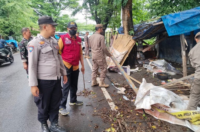 Bhabinkamtibmas Polsek Tamalate, bersama 3 Pilar Dampingi Satpol PP Tertibkan Bangunan Liar di wilayah Kelurahan Jongaya.