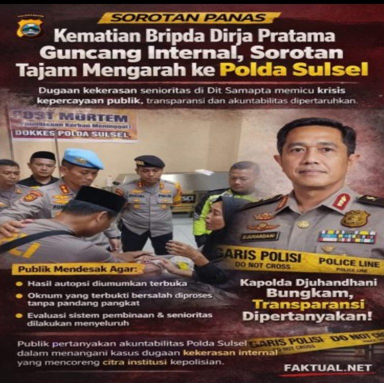 Sorotan Tajam ke Polda Sulsel, Kematian Bripda Dirja Picu Tekanan Publik dan Krisis Kepercayaan